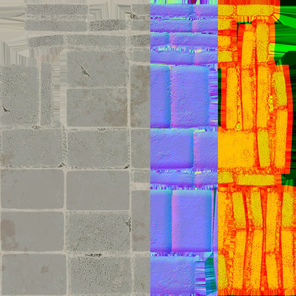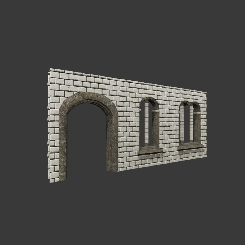 everything is significantly higher fidelity now; textures have been bumped up to 4k (because why not), and the models themselves have more proper and evenly dispersed topology. i am also allowing more textures to be used, as texile density was also becoming an issue during wip.02. wall bricks and column bricks, for example, are split into 2 respective materials, and i added a separate mortar material for what lies behind the bricks.
